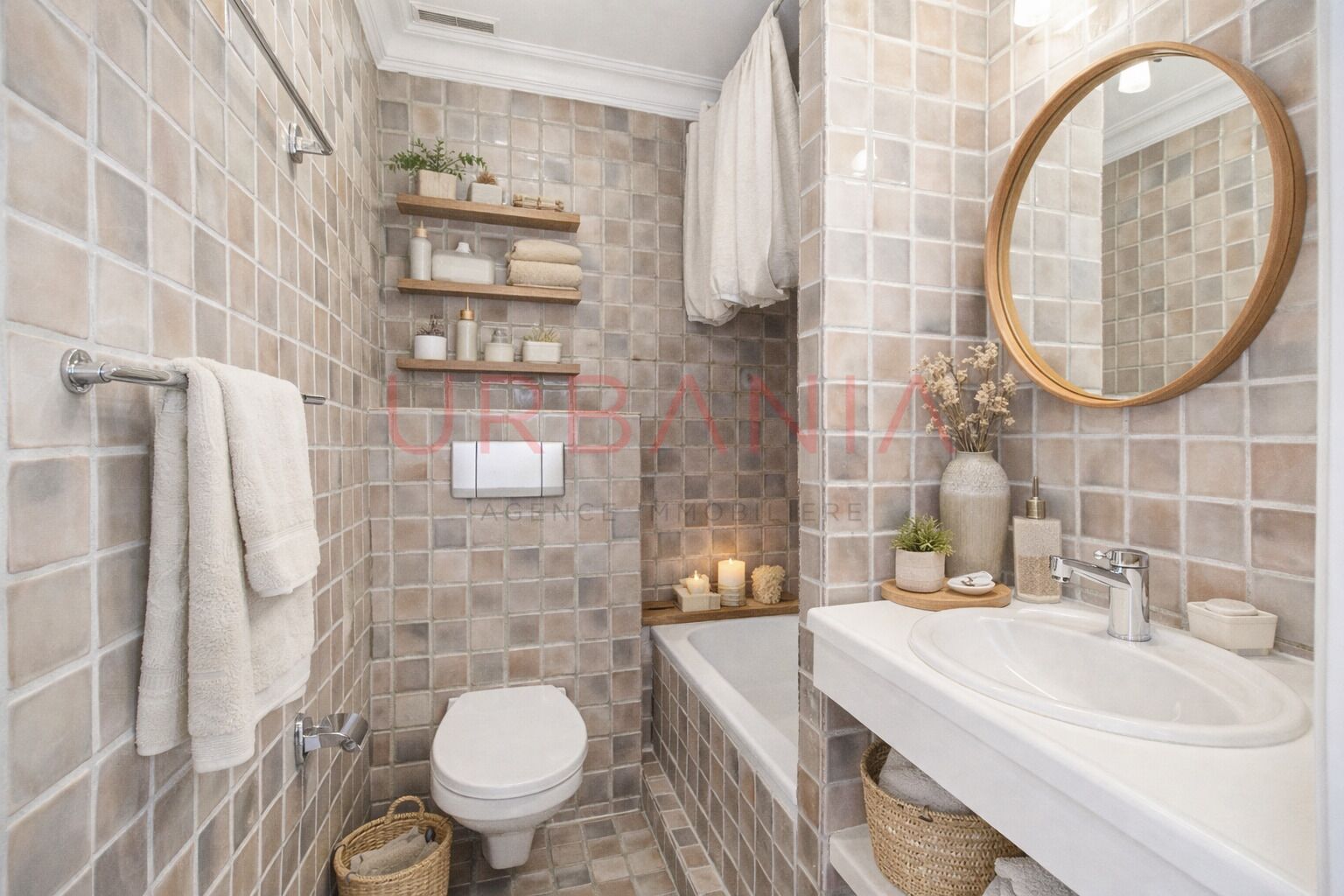 La salle d’eau, aménagée avec soin, comprend une douche, un lavabo, des toilettes ainsi que des espaces de rangement, le tout dans une ambiance harmonieuse aux finitions de qualité.