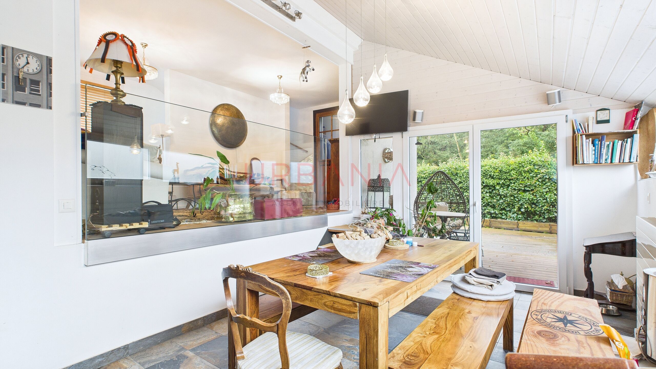 Profitez d'une terrasse couverte pour vos repas en plein air. Ce bien rare à la vente est une occasion unique de vivre dans un havre de paix à Genève.